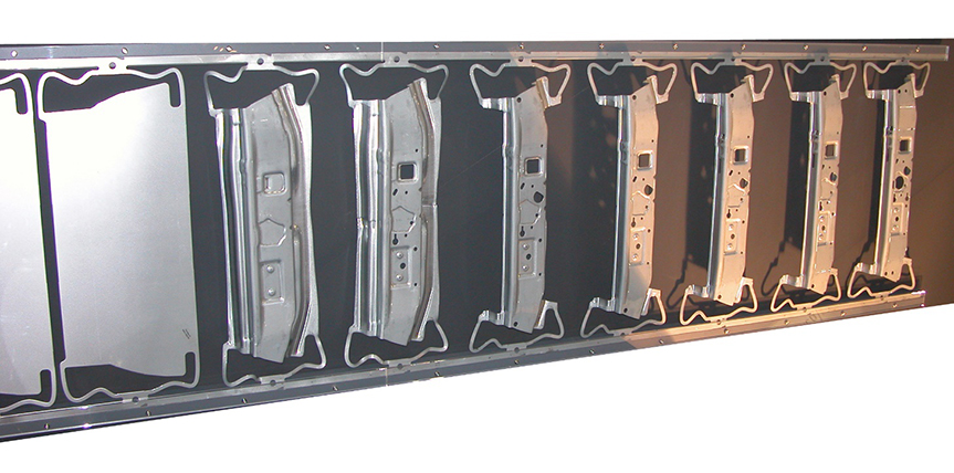 多工位、級(jí)進(jìn)模線適用于汽車、農(nóng)機(jī)、軸承、電機(jī)、電器、輕工、紡織機(jī)械等各工業(yè)部門。這種壓力機(jī)在一次工作行程中可完成多道工序,如落料、沖孔、拉伸、彎曲、切割、校正等, 是一種高效率壓力機(jī);與普通壓力機(jī)相比,多工位壓力機(jī)具有能自動(dòng)上下料、材料利用率高、能源消耗低、生產(chǎn)效率高、壓力機(jī)占地面積小、生產(chǎn)成本低等優(yōu)點(diǎn),對(duì)大批量生產(chǎn)非常適用。